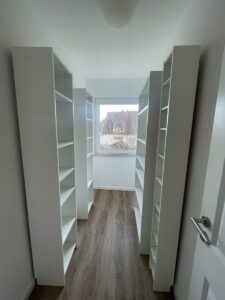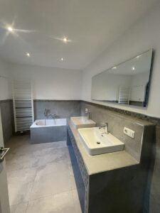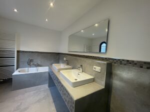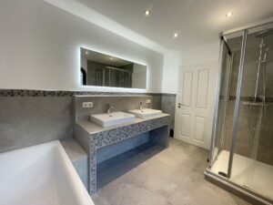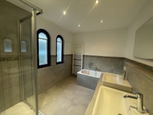- Obergeschoss: modernes Badezimmer, WC, zwei Schlafzimmer jeweils mit Zugang zum Balkon, Ankleidezimmer und Balkon