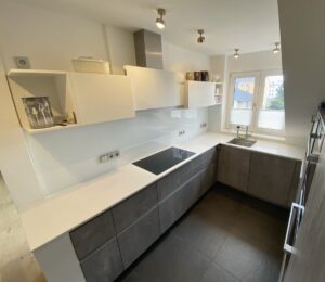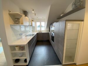 Die Wohnung überzeugt mit vier clever geschnittenen Zimmern, zwei Duschbädern und einer edlen Markeneinbauküche, die bestens ausgestattet ist. Der passionierte Koch kann hier die Vorzüge eines großen Induktionskochfeldes mit Abzugshaube, einem unbenutzten Dampfgarers, Backofen, Tellerwärmer (!), einer Spülmaschine und eines großen Kühlschranks mit Gefrierfächern zurückgreifen. Viel Stauraum für Geschirr und Kochutensilien bieten die gut angeordneten Einbauschränke.